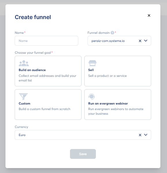 At this stage, Systeme.io asks you to choose a funnel goal. Depending on your objective, you can select options such as: