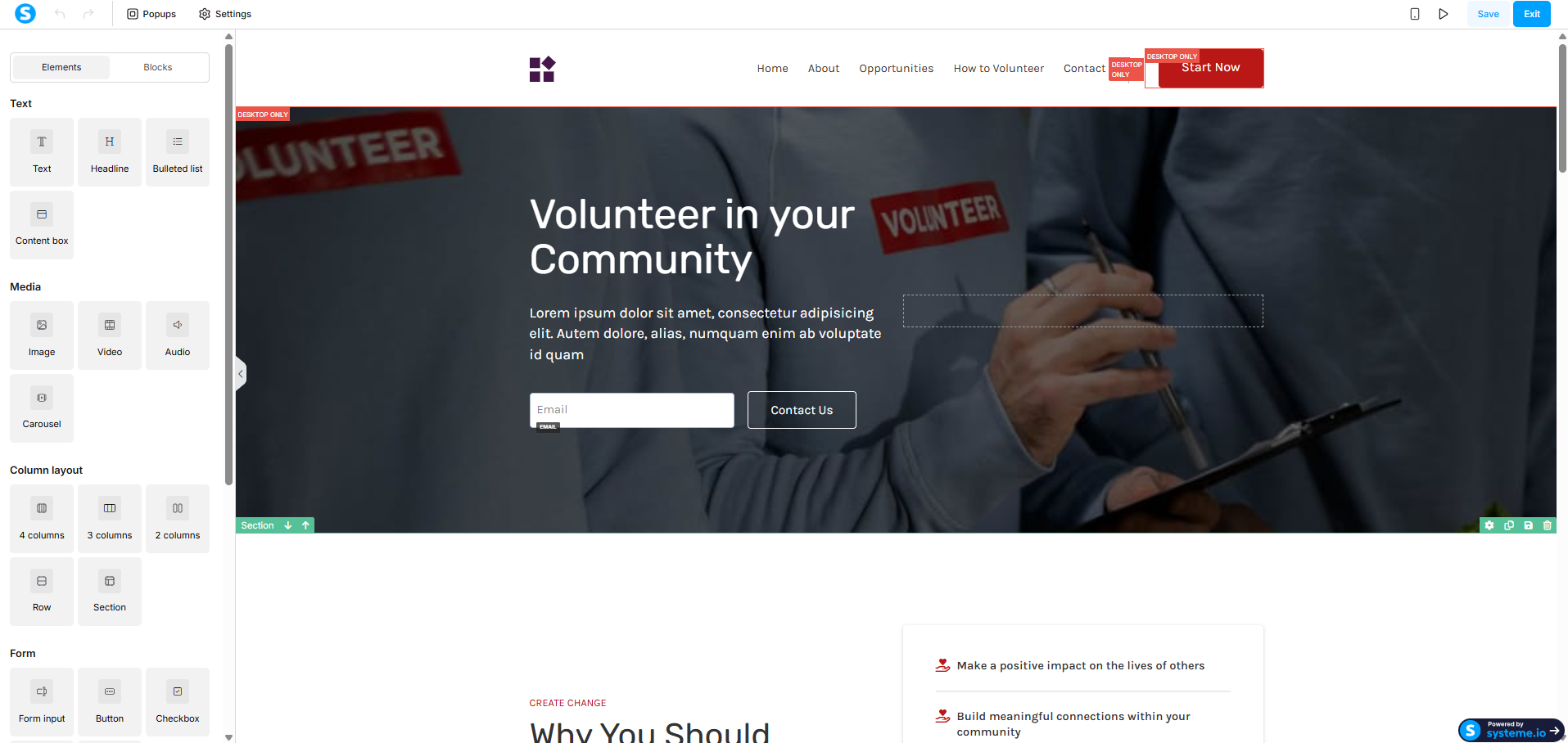 The visual editor lets you modify text, buttons, images, and layout blocks directly on the page. The opt-in form is already connected to Systeme.io’s contact system by default, so no extra integration is required.
